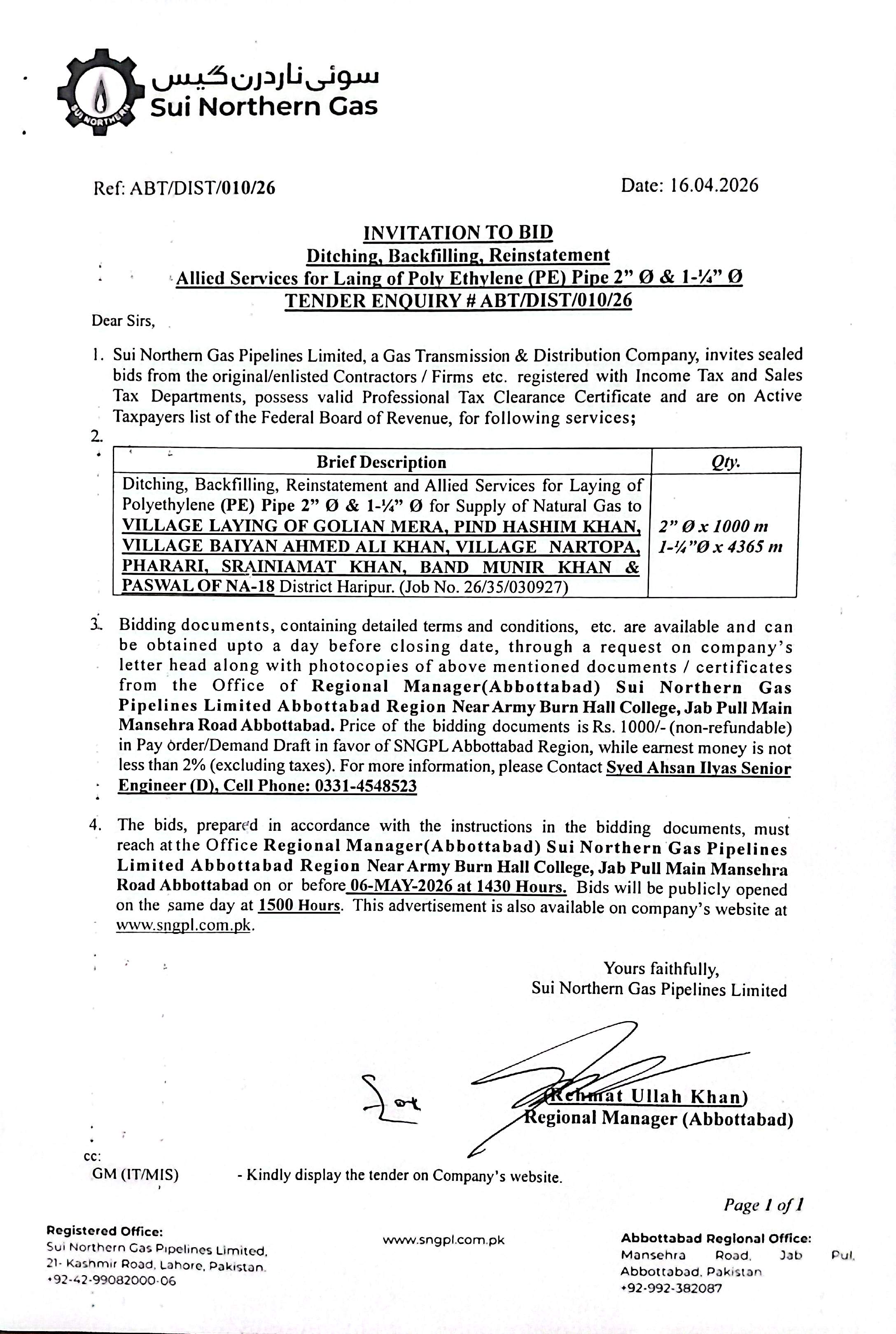| Ditching, Backfilling, Reinstatement and Allied Services for Laying of Polyethylene (PE) Pipe 2" Dia & 1-1/4" Dia for Supply of Natural Gas to VILLAGE LAYING OF GOLIAN MERA, PIND HASHIM KHAN, VILLAGE BAIYAN AHMED ALI KHAN, VILLAGE NARTOPA, PHARARI, SRAINIAMAT KHAN, BAND MUNIR KHAN & PASWAL OF NA-18 District Haripur. (Job No. 26/35/030927) | 2Ø x 1000 1-¼Ø x4365 m |