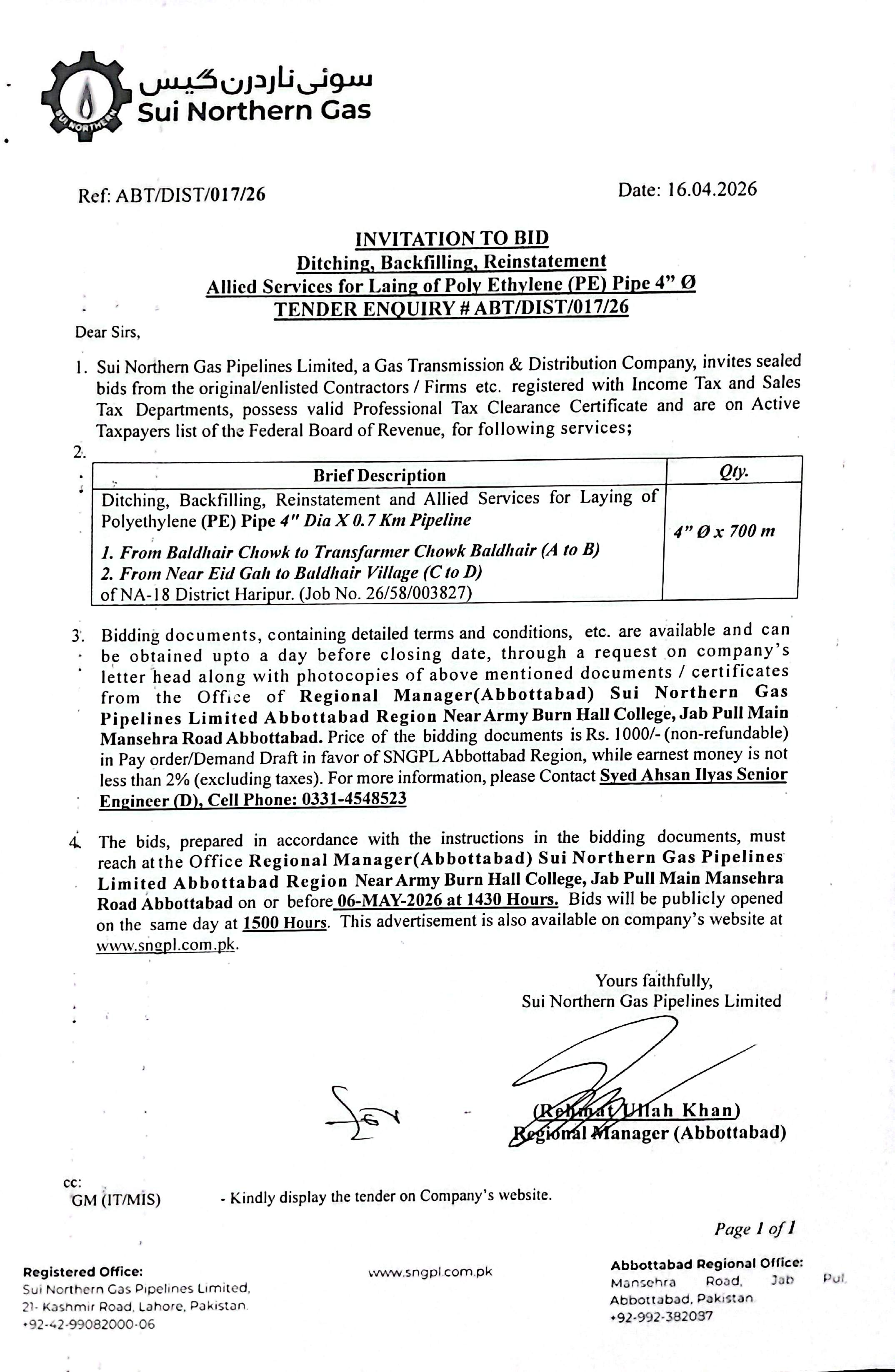 | Ditching, Backfilling, Reinstatement and Allied Services for Laying of Polyethylene (PE) Pipe 4" Dia X 0.7 Km Pipeline 1. From Baldhair Chowk to Transfarmer Chowk Baldhair (A to B) 2. From Near Eid Gah to Baldhair Village (C to D) of NA-18 District Haripur. (Job No. 26/58/003827) | 4”Dia x 700 m |