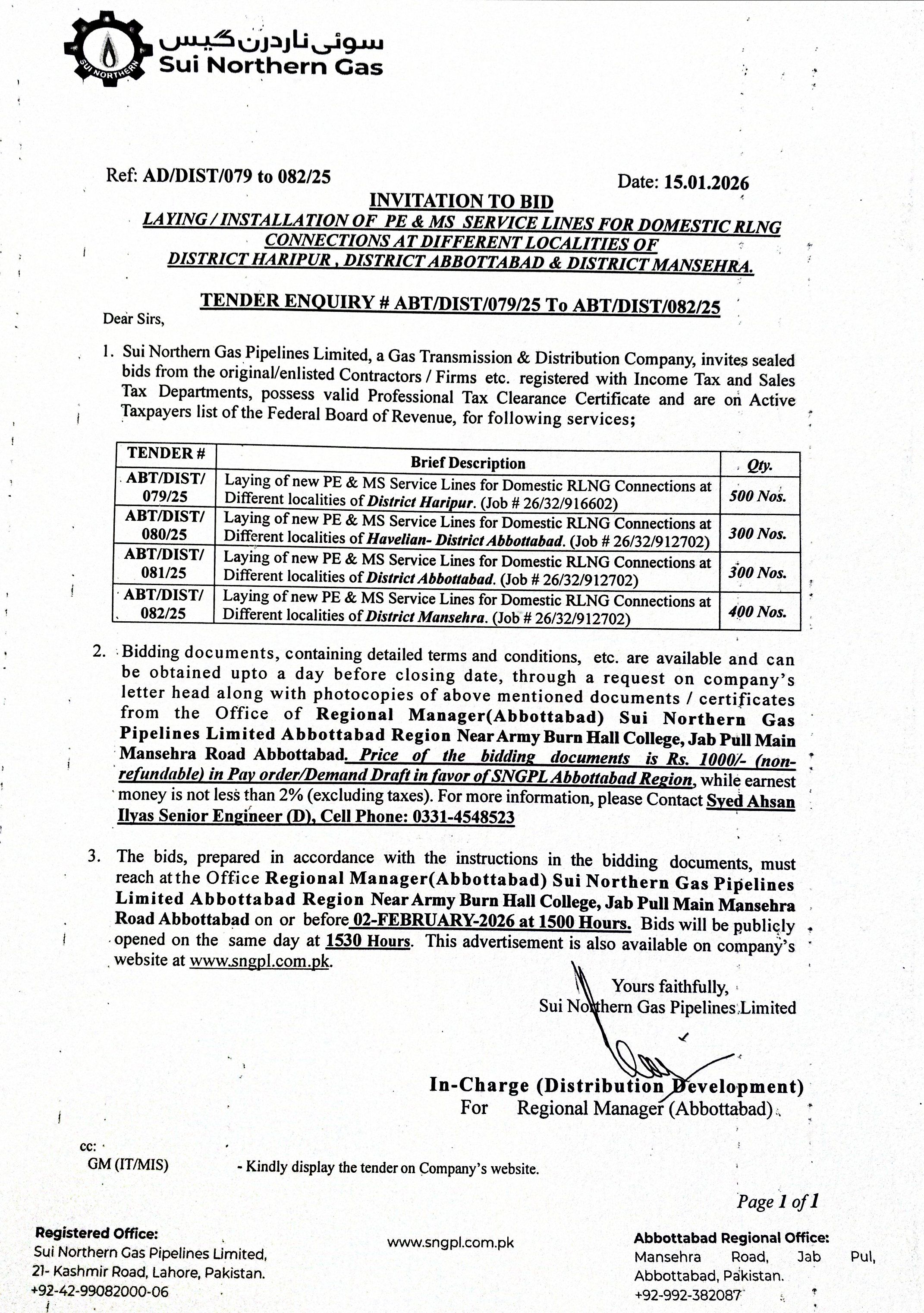 | Laying of new PE & MS Service Lines for Domestic RLNG Connections at Different localities of District Abbottabad. (Job # 26/32/912702) | Nos. of Service Lines 300 |