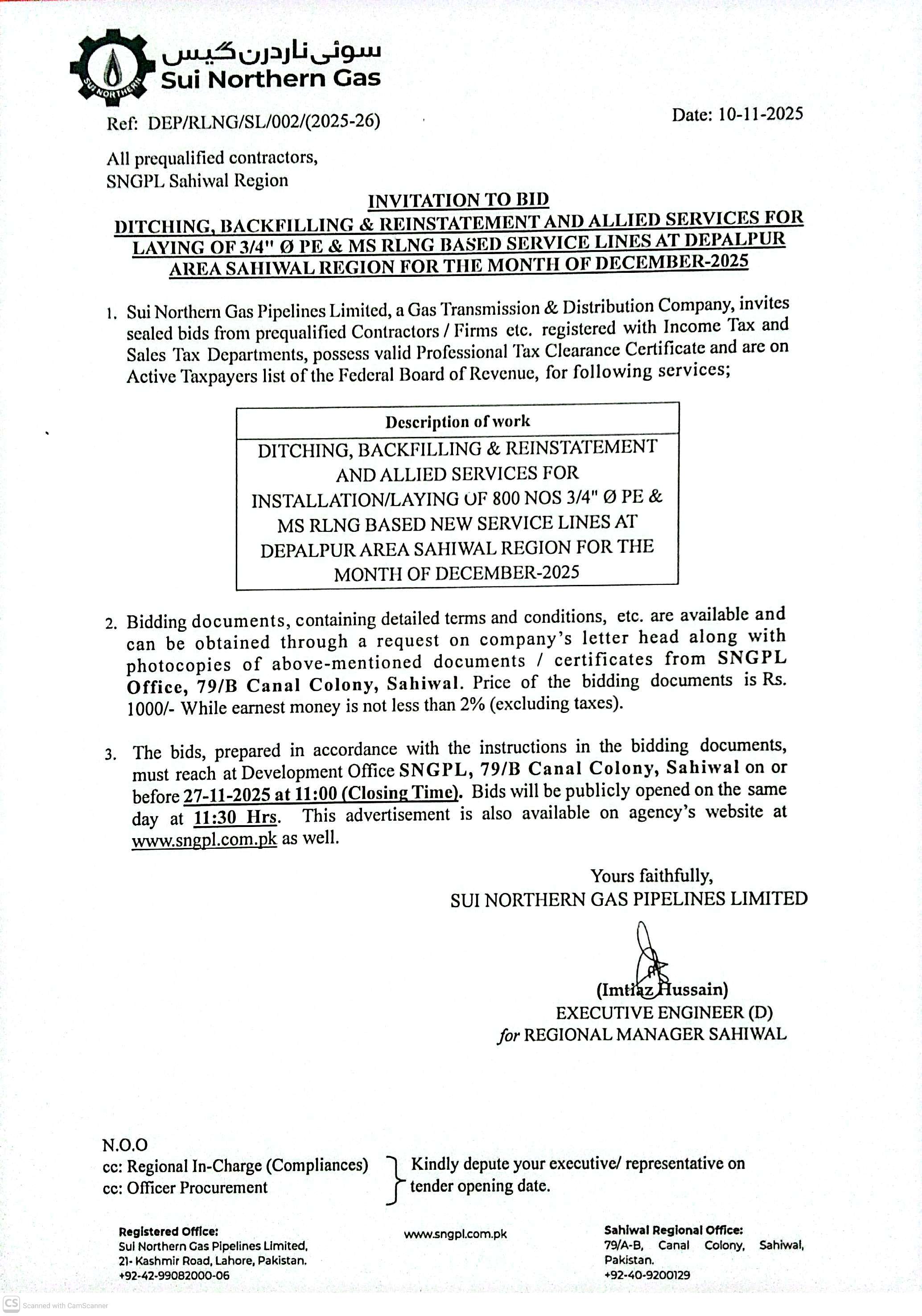 | DITCHING, BACKFILLING & REINSTATEMENT AND ALLIED SERVICES FOR INSTALLATION/LAYING OF 800 NOS 3/4" Ø PE & MS RLNG BASED NEW SERVICE LINES AT DEPALPUR AREA SAHIWAL REGION FOR THE MONTH OF DECEMBER-2025 | 800 |