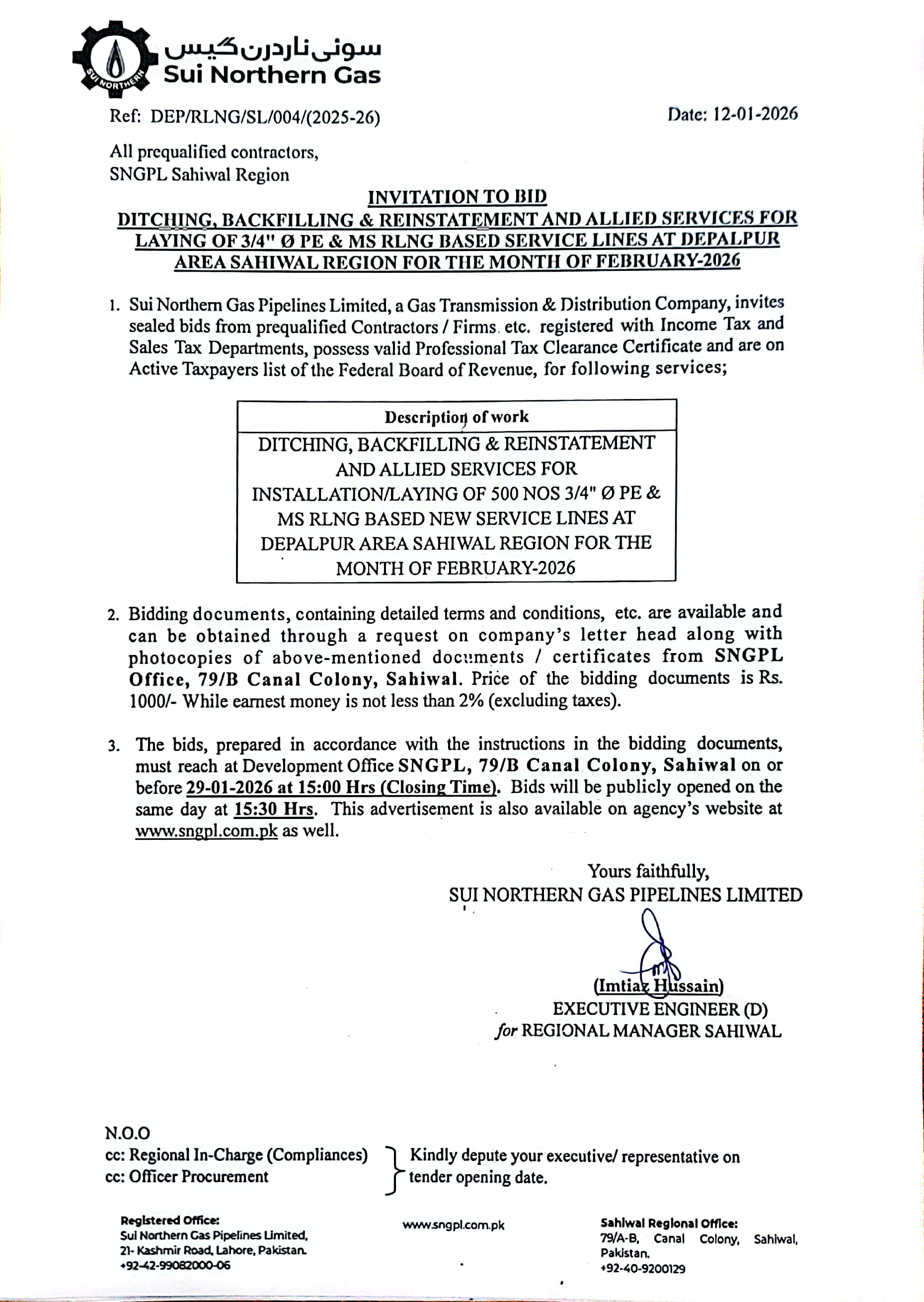 | DITCHING, BACKFILLING & REINSTATEMENT AND ALLIED SERVICES FOR INSTALLATION/LAYING OF 500 NOS 3/4" Ø PE & MS RLNG BASED NEW SERVICE LINES AT DEPALPUR AREA SAHIWAL REGION FOR THE MONTH OF FEBRUARY-2026 | 500 |
