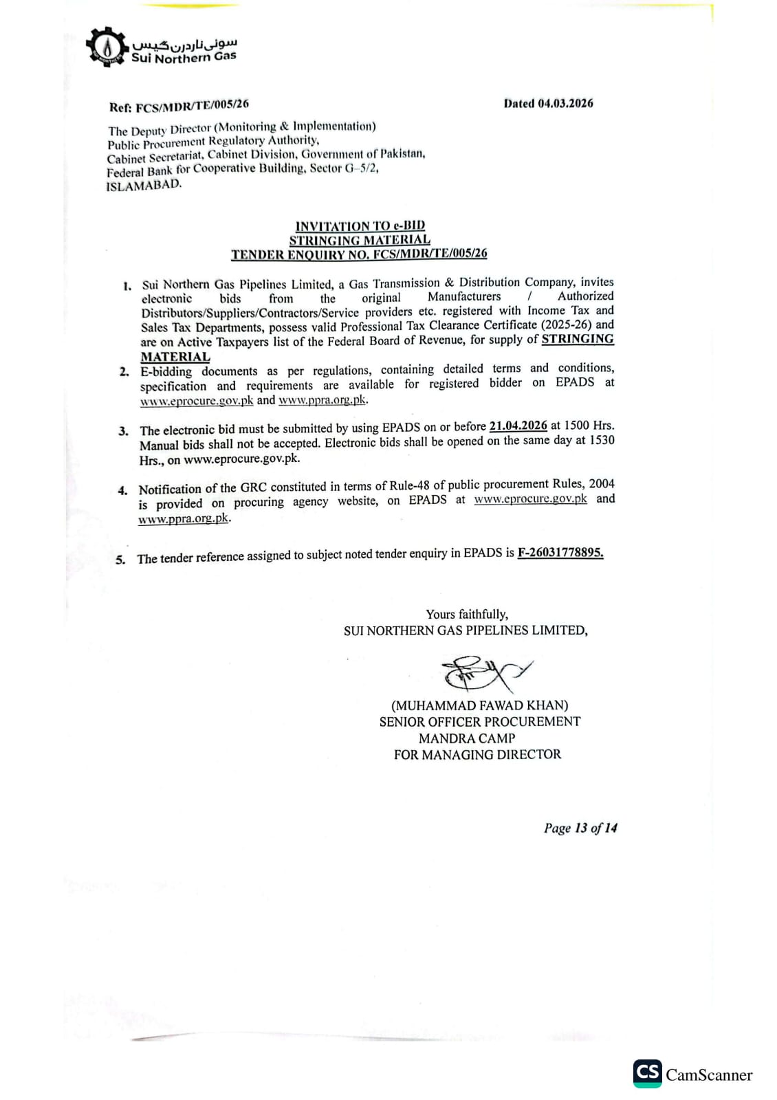 | FCS/MDR/TE/005/26 | 21, Apr 2026 03:00 PM |
