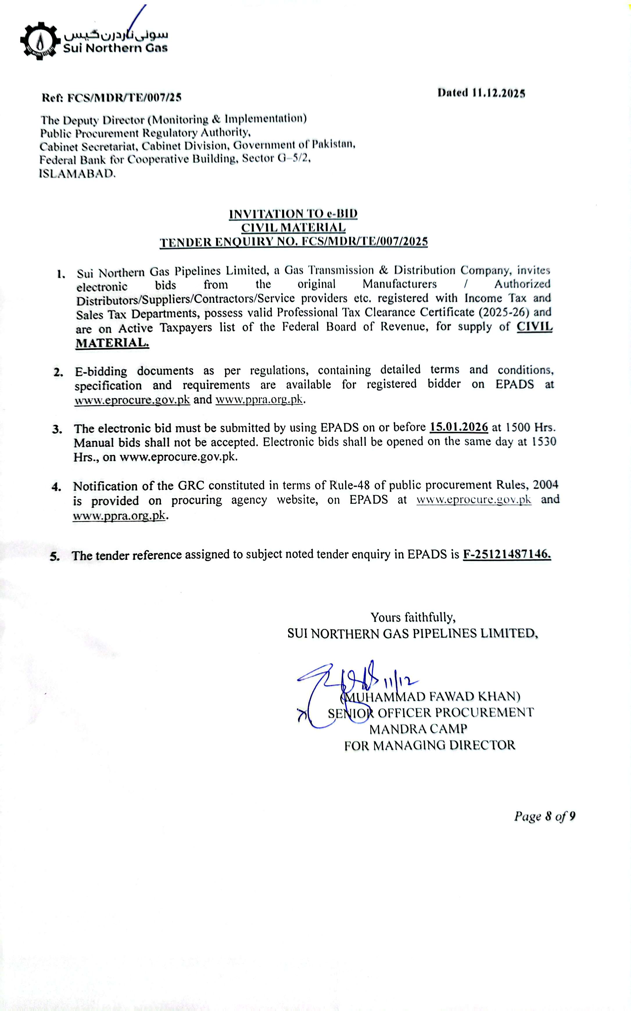 | FCS/MDR/TE/007/25 | 15, Jan 2026 03:00 PM |