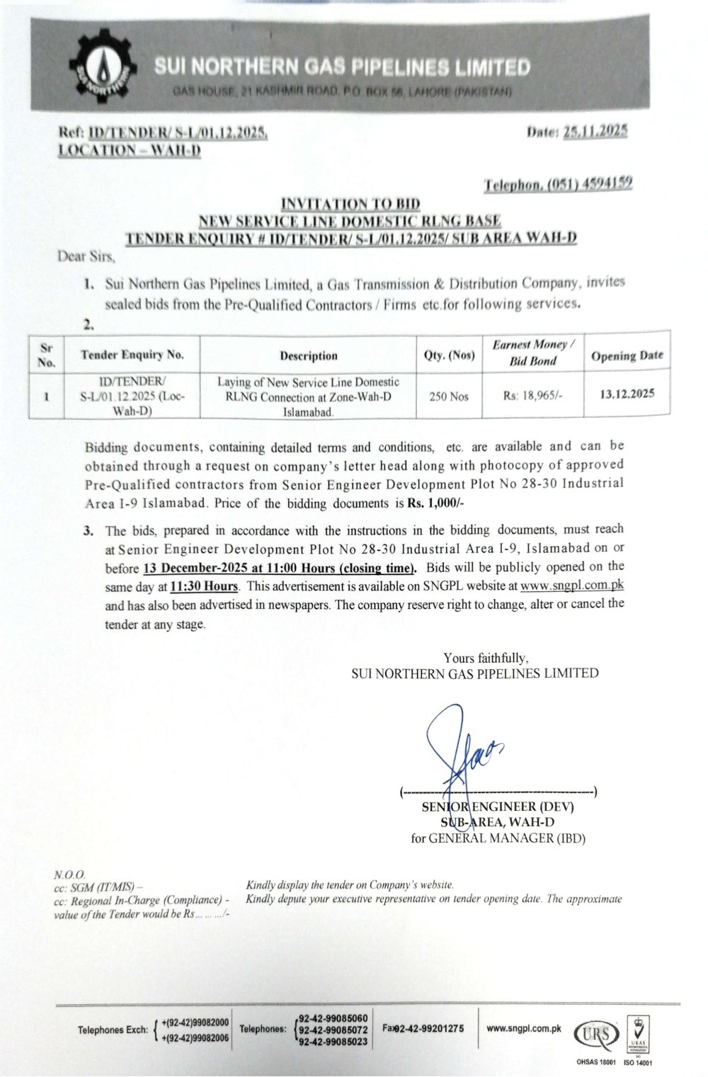 | LAYINIG OF NEW SERIVICE LINE DOMESTIC RLNG CONNECTION AT SUB AREA WAH D ISLAMABAD | 250 NOS |