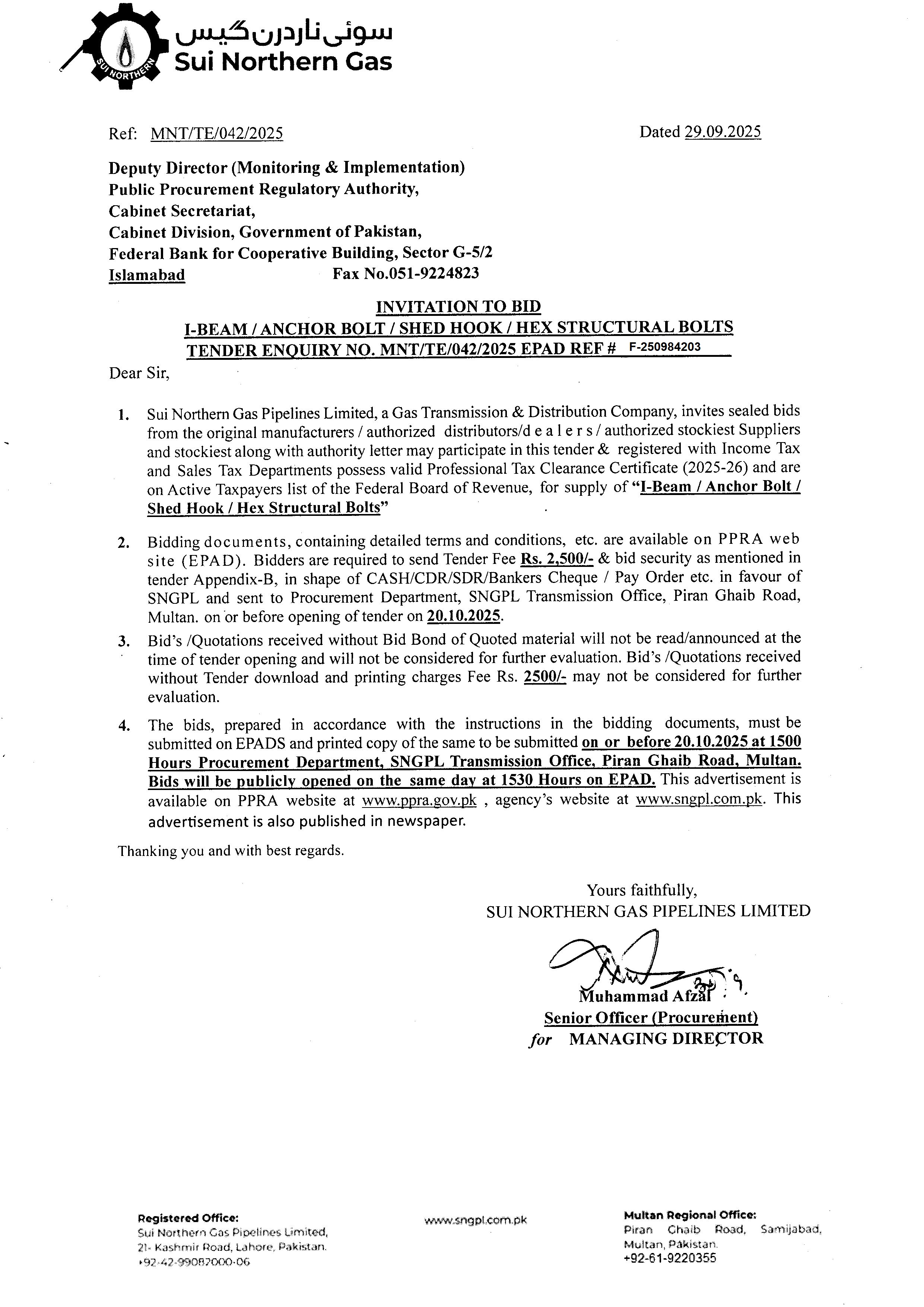 I-BEAM / ANCHOR BOLT / SHED HOOK / HEX STRUCTURAL BOLTS EPAD REF # F-250984203 TENDER FEE RS. 2,500/- | null |
