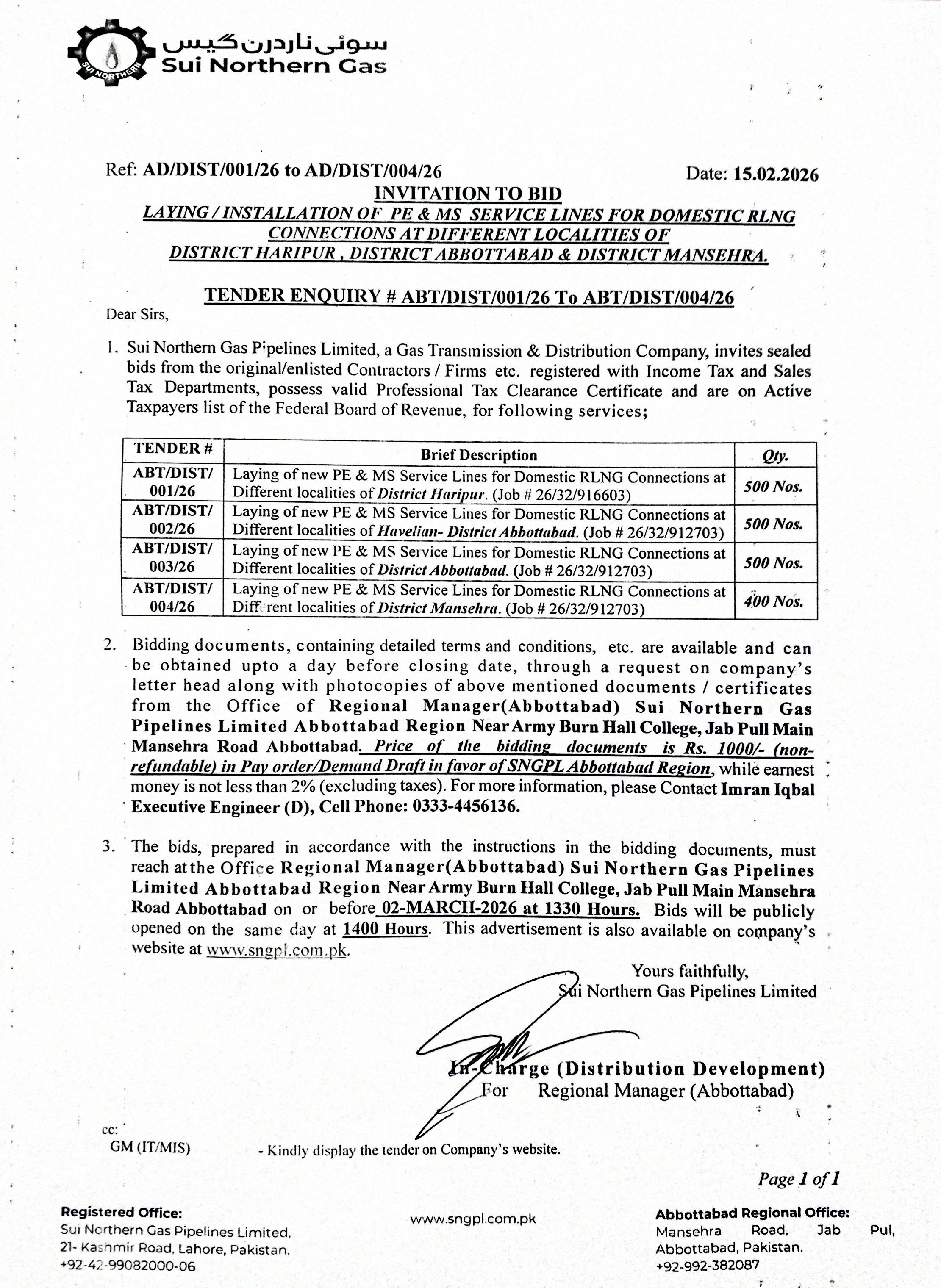 | Laying of new PE & MS Service Lines for Domestic RLNG Connections at Different localities of Havelian- District Abbottabad. (Job # 26/32/912703) | Nos. of Service Lines 500 |