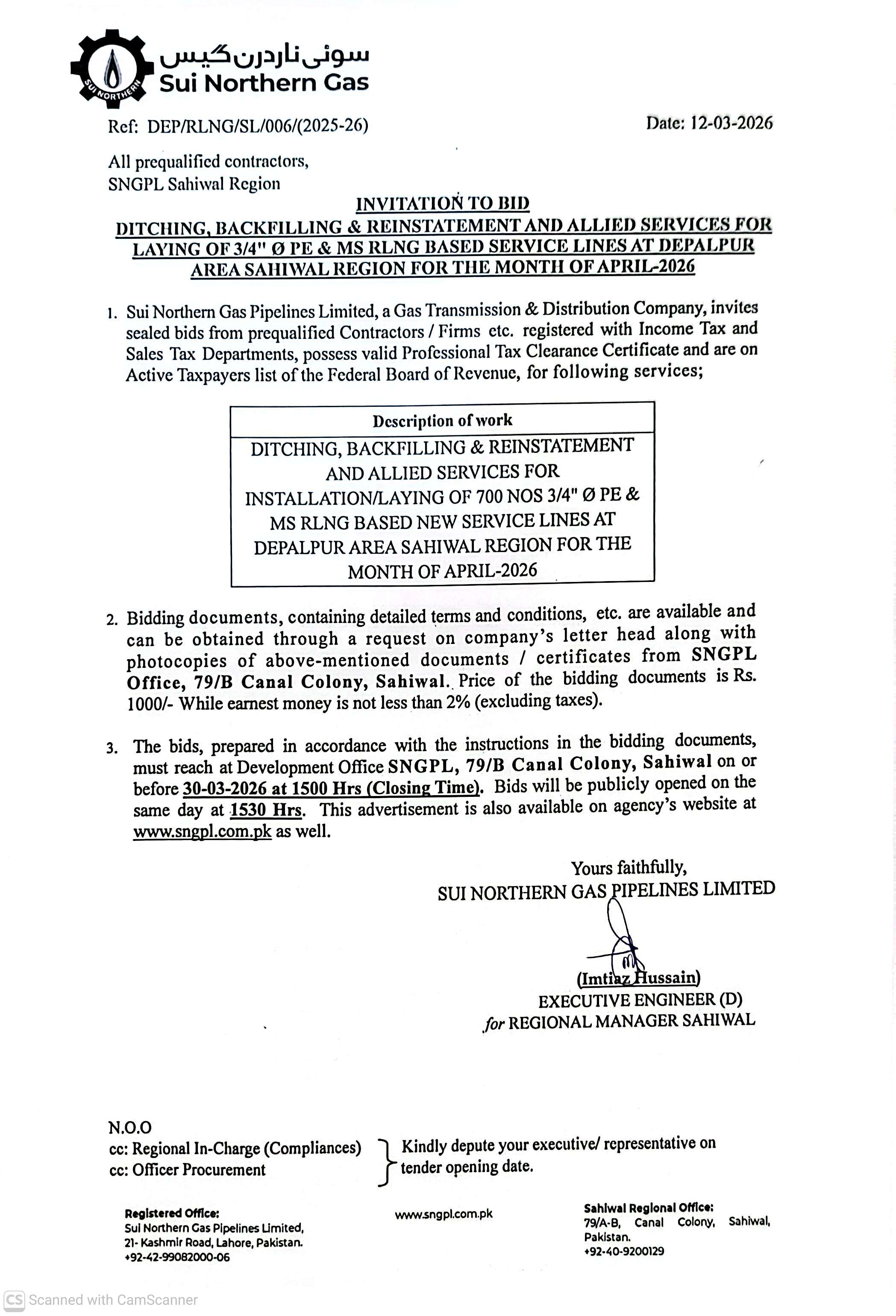| DITCHING, BACKFILLING & REINSTATEMENT AND ALLIED SERVICES FOR INSTALLATION/LAYING OF 700 NOS 3/4" Ø PE & MS RLNG BASED NEW SERVICE LINES AT DEPALPUR AREA SAHIWAL REGION FOR THE MONTH OF APRIL-2026 | 700 |